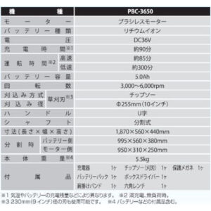 【仕様】本体サイズ:長さ1870×幅562×高さ440mm本体重量:5.5kgモーター:ブラシレスモーター、バッテリー/リチウムイオン、容量/5.0Ah、電圧/36V、充電時間/約90分、運転時間(無負荷時)/高速約85分,低速約300分、回転数/3000-6000rpm、回転数調整/手元スイッチ式、刈込み方式/チップソー、刈込み径/255mm 、ハンドル/U字ハンドル、シャフト/分割式セット内容:電池パック2個、充電器、肩掛けバンド・チップソー(255)・チップソーカバー・保護メガネ・レンチ